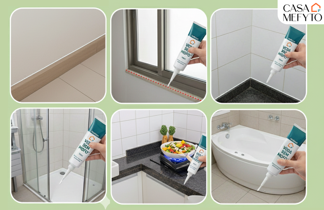 De pias a vasos sanitários, de rejuntes no box até pequenas frestas na cozinha ou lavanderia — o Veda Sem Mofo! é versátil e funciona em diferentes superfícies.